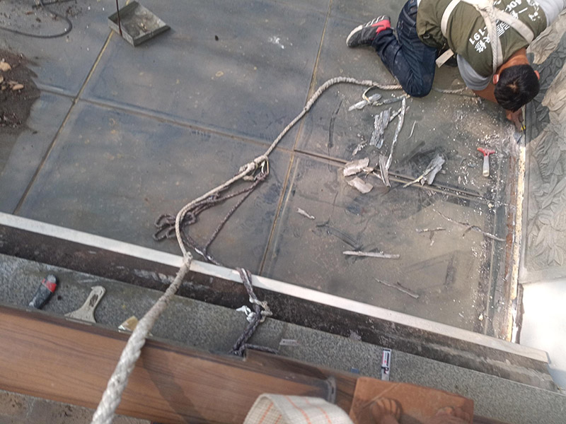 2、如果之前做過防水,需要局部鑿除原有防水層和找平層,找到滲漏位置,將找平層空鼓部位鑿除。在鑿除前應(yīng)用手持切割機(jī)將找平層切割開,防止鑿除找平層時(shí)因震動(dòng)產(chǎn)生新的空鼓。找到滲漏位置后,清理干凈,采用聚氨酯涂膜1.5mm厚。